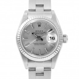 Pre-Owned Rolex Datejust in stainless steel watch features a silver color dial with stick hour markers, fluted bezel and oyster bracelet.