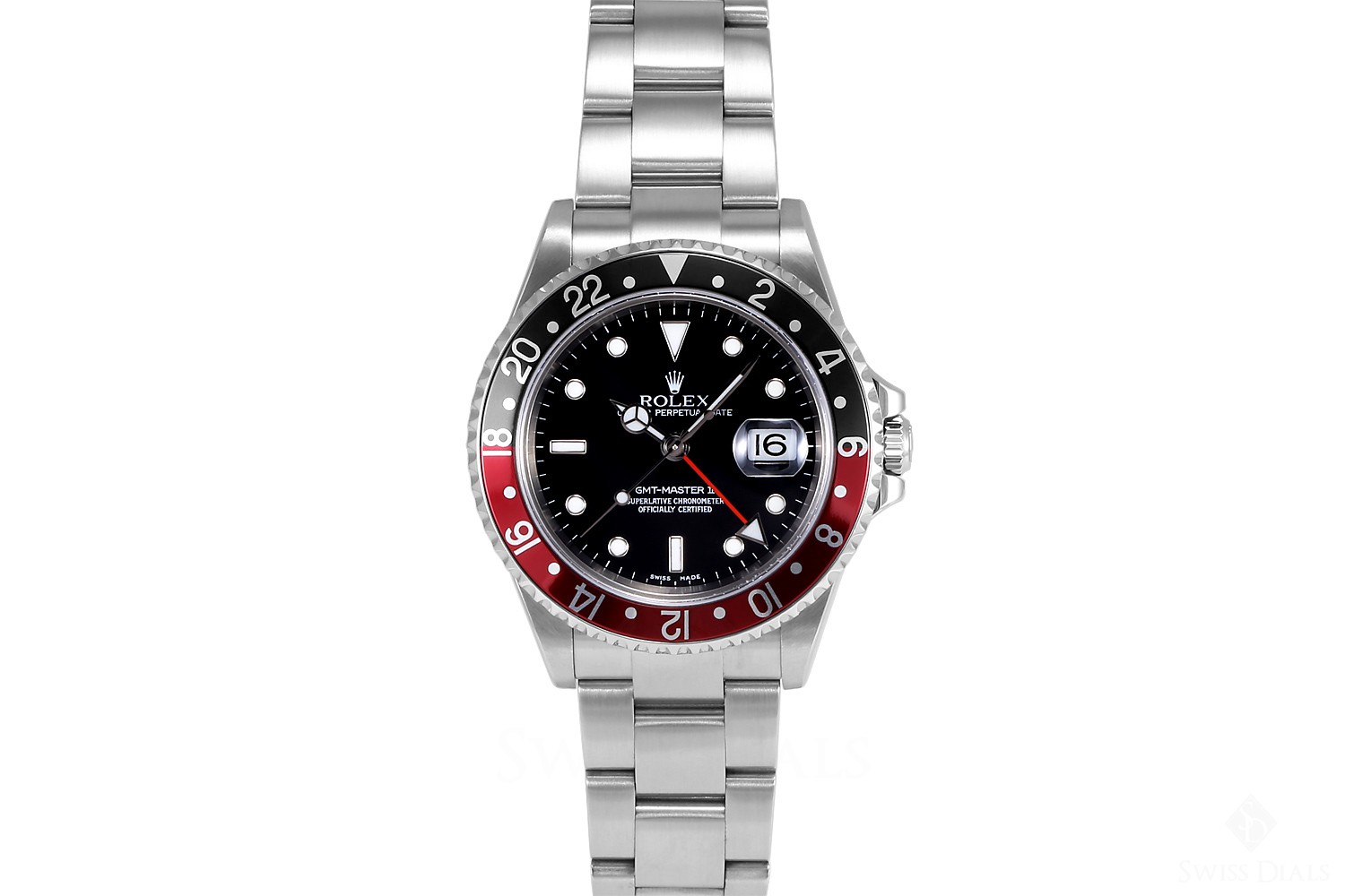 The sport Rolex GMT-Master II stainless steel watch features a black color dial, black and red 24 hour bezel and oyster bracelet, No Holes Case. This Rolex watch is detailed and polished to showroom condition. The Rolex automatic movement is serviced ensuring accurate time and functionality. This pre-owned Rolex watch comes with a complementary Swiss Dials 2 year warranty covering the movement.
